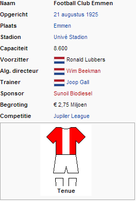 FC Emmen is een Nederlandse voetbalclub uit Emmen, die werd opgericht op 21 augustus 1925. De club speelt sinds 1985 profvoetbal en komt uit in de Eerste divisie. Het is de enige profvoetbalclub uit de provincie Drenthe. De traditionele uitrusting van FC Emmen bestaat uit een rood shirt met een verticale brede witte baan in het midden en een witte broek. Thuiswedstrijden worden afgewerkt in het Univé Stadion.